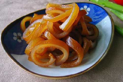 做法:1.把猪皮用开水者如心孰后捞出放入凉水中过一下,这样猪皮比较有嚼劲,把猪皮切成大小差不多的条形,放到4 边待用;