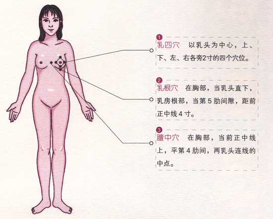 用拇指顺时针点揉乳四穴,每穴约2分钟,以局部有酸胀感为佳。