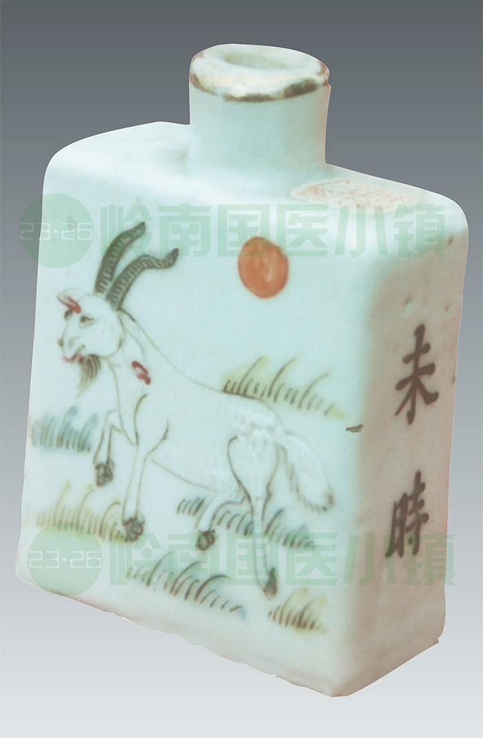 4/12十二时辰方形小药瓶(未时)【朝代:清代。质地:陶瓷类。尺寸规格:通高6.51厘米,外口径1.60厘米,瓶身长4.55厘米,瓶身宽2.15厘米,瓶身高5.33厘米,重65克。瓷质,长方形,平底,细颈,平口,正面绘未羊像,侧面书有“未时”。用途:盛药用。藏馆:广东中医药博物馆。】