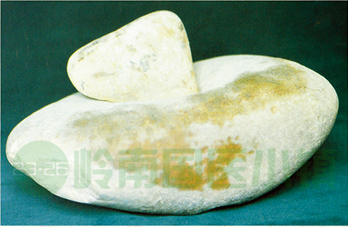 【药臼】西汉。西安市十里铺新石器时代遗址出土。石质。长27cm,高11cm。呈不规则扁圆形,带天然石杵一件。陕西医史博物馆