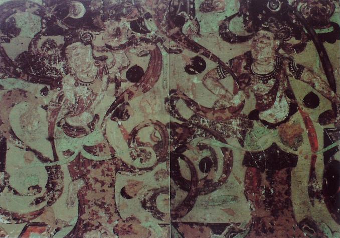 【舞蹈图】 采自敦煌莫高窟217窟北壁。是壁画中少见的拓枝舞,舞者手执长带,在莲花上急速旋转。