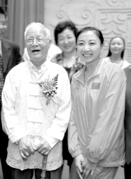 邓铁涛(左)与奥运蹦床冠军何雯娜合影