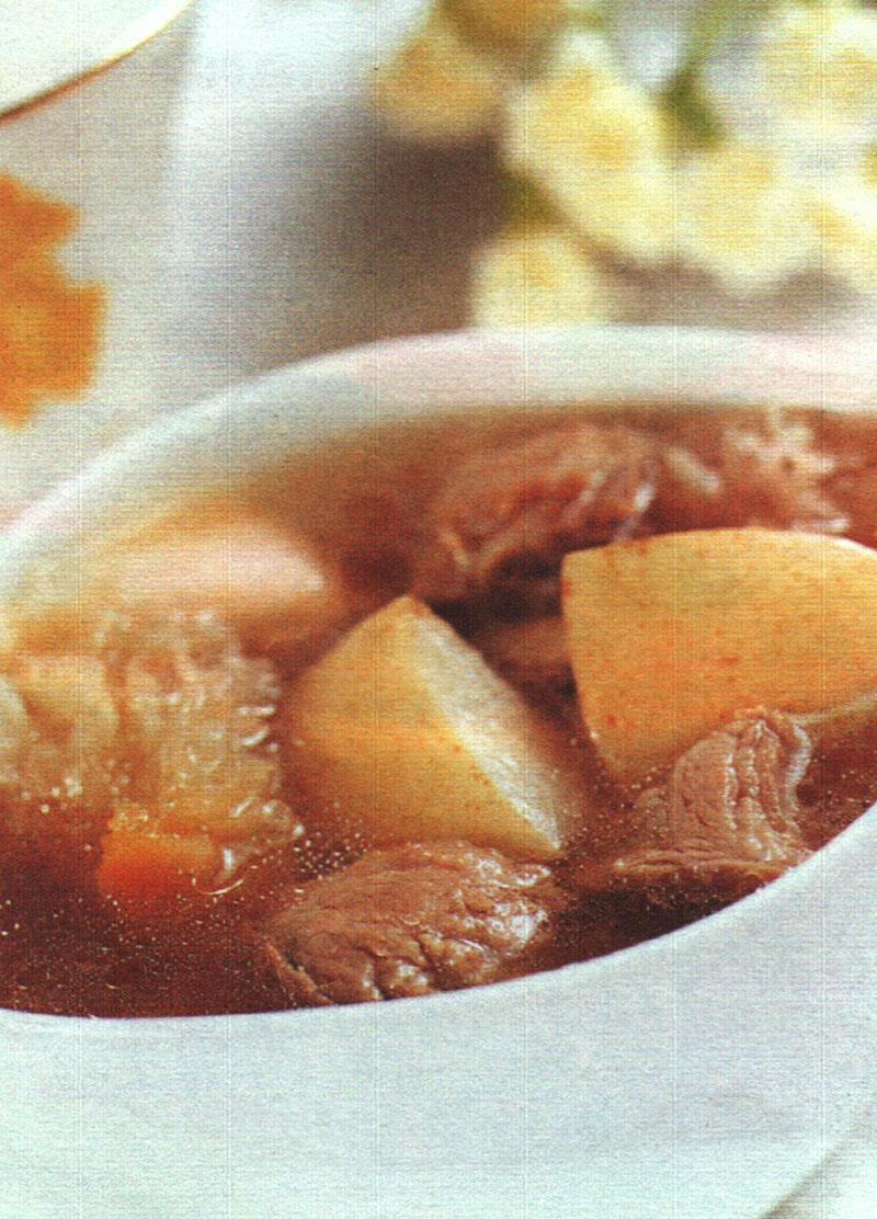 2、将猪瘦肉、鸭汆水去净血污,洗净后加入火腿、青橄榄、生姜、料酒,装入盅内炖2小时。