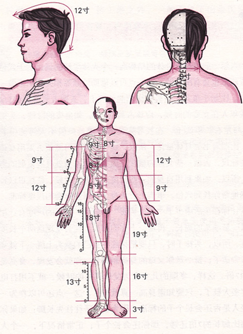 当然,如果对于身体的结构有一个大体了解的话,对于穴位的位置确定也会有所帮助,这一点可以借助绘画等相关知识来做一些了解。比如小孩儿,一般在比例的处理上,头部占到身体的14,而成年人在立姿的时候,应该占到约17,如坐姿的时候,头部占到15左右。事实上,在找寻穴位的时候,一般不大可能带着尺子、比照着书去具体量化。所以,这个时候尽可能地去采用身体的一些标尺,去做一些大体的量化。因为身体本身就具有发展的协调性,所以,如果利用自身的一些尺度去衡量的时候,往往可以较为准确地帮你找到穴位。事实上,人身上有很多有趣的尺度标准,这可以让你在生活中少了“郑人买履”的麻烦。这样的尺度有:用皮尺量一量拳头的周长,再量一下你的脚长,你会发现这两个长度很接近。所以,买袜子时,只要把袜底在自己的拳头上绕一下就知道是否合适了;量一量你父母的身高和脚长,你就会发现,身高是脚长的7倍。这样,孝顺的儿女在为父母买鞋的时候,就不用打电话问穿多大鞋了,只要知道身高一算就有了,这一点还可以作为一些年轻人是否还会长个子的标准。因为长个子往往先长脚,如果你的身高比脚长的7倍还矮,那你还会长个子;正常情况下,一个人手腕的周长恰恰是他脖子周长的一半;而一个人两臂平伸的长度正好等于身高。如此种种,中医里也有了“同身寸”的说法,比方说,用自己的手指就可以作为寻找穴位的一个尺度,如一般情况下,大拇指指间关节的宽度是“1寸”,食指和中指在并列的时候,从指尖算起第二关节的宽度就是“15寸”,把四指并拢的时候,第二关节的宽度就是“3寸”;从结构上来看,低头的时候,脖子后部正中最突出的凸骨就是第7颈椎,紧接着的凸骨就是第1胸椎,而平常在系腰带的时候,左右两侧突出的骨头与第4腰椎的位置约在一条线上。
