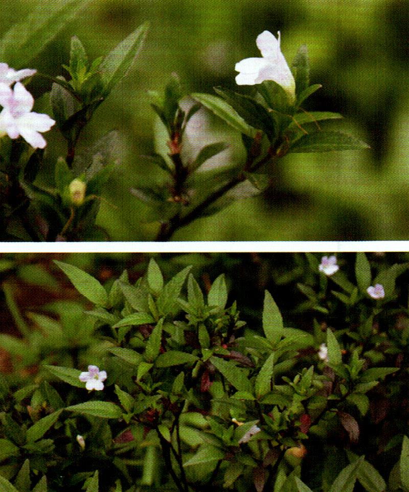 【识别特征】多年生灌木状直立草本。茎丛生,四棱形,节 膨大,呈红紫色。叶 对生,披针形,基部狭楔形,边缘有疏 钝锯齿,两面均无毛,两面具粗大线状凸起的钟乳体。花 短 穗状花序顶生。苞片覆瓦状张开;花冠直,淡紫色,钟形, 冠管圆柱形。果 蒴果。