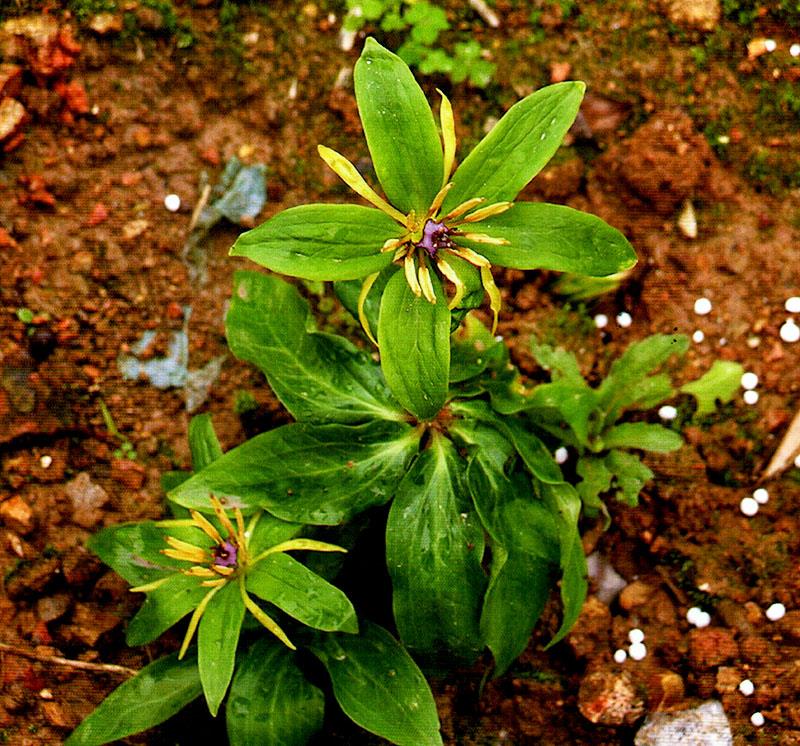 【别名】:重楼、草河车、七叶莲、独叶一枝花【形态特征】:多年生宿根花卉。根状茎肥厚,棕褐色,有斜形环节。茎直立,圆柱 形,光滑。叶5〜10片,通常为7片,轮生茎顶,矩圆形、椭圆形或倒卵状披针形。花黄 绿色,有柄,自轮生叶的中间抽出。蒴果球形。花期春、夏季。【分布…